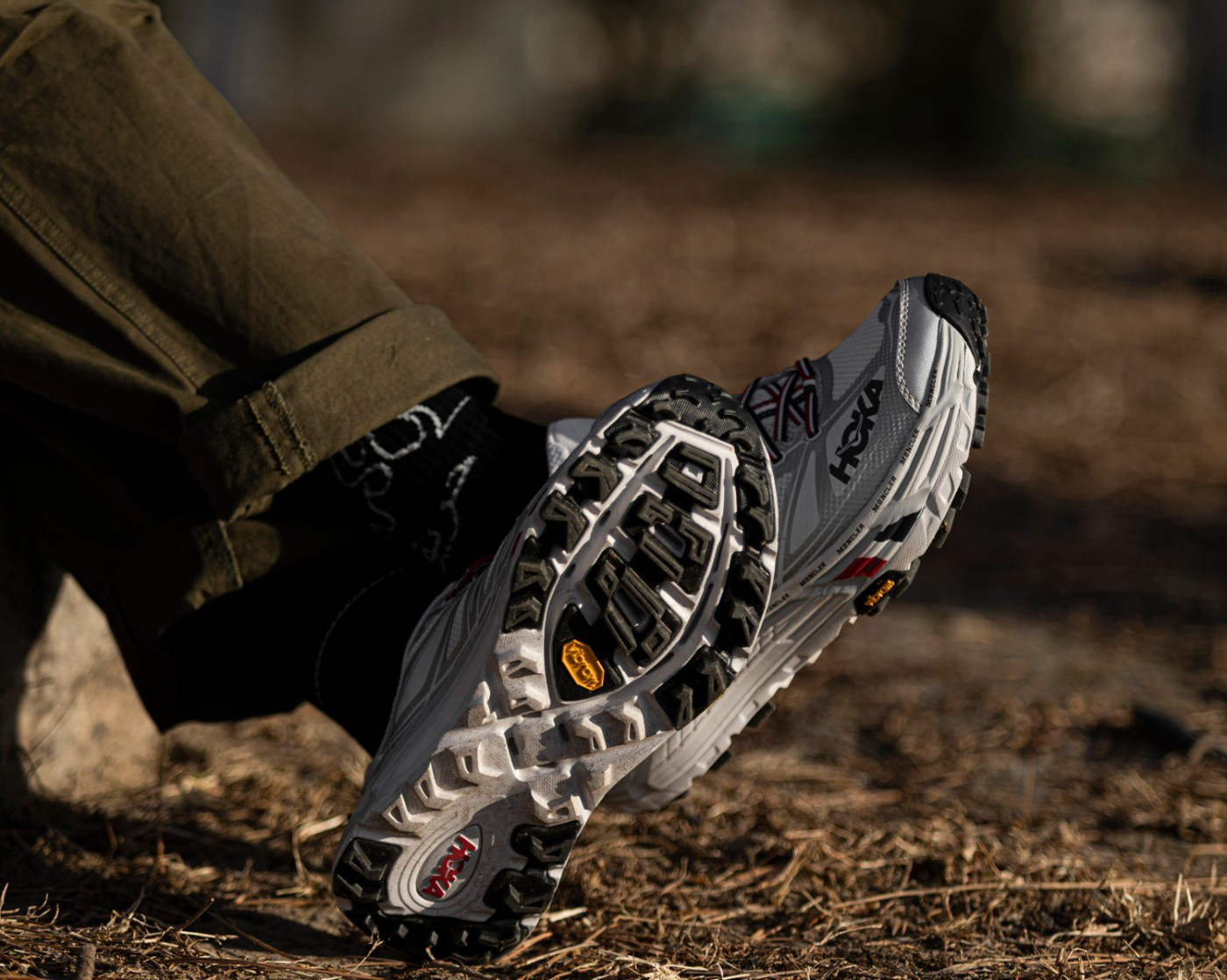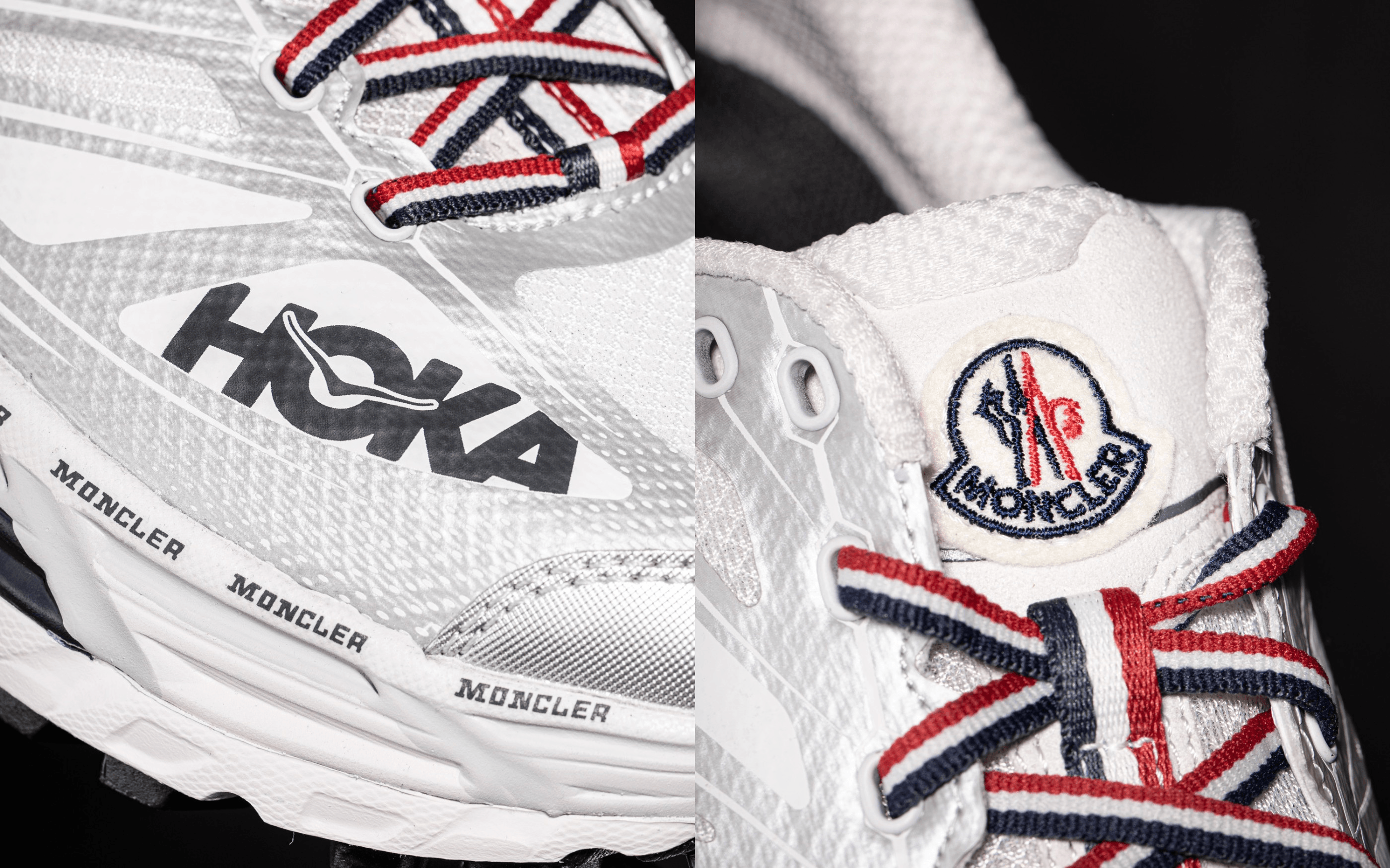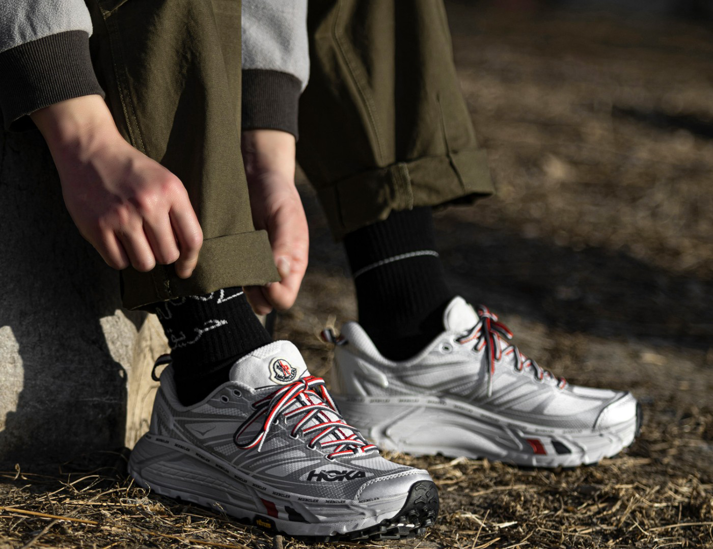 HOKAは、スピードをもって飛ぶように山を下ることを目的に、アスリートにより設立されました。そして、今では「Time To Fly」、あらゆる人に飛ぶような体験をしてもらうためのパフォーマンスフットウェアブランドとして知られています。Monclerもまた、革新的なダウンジャケットで知られており、長年にわたりラグジュアリースポーツの世界的なアイコンとなっています。そんなMonclerとHOKAが、それぞれのスタイルを融合させ、高性能なマウンテンシューズをデザインしました。