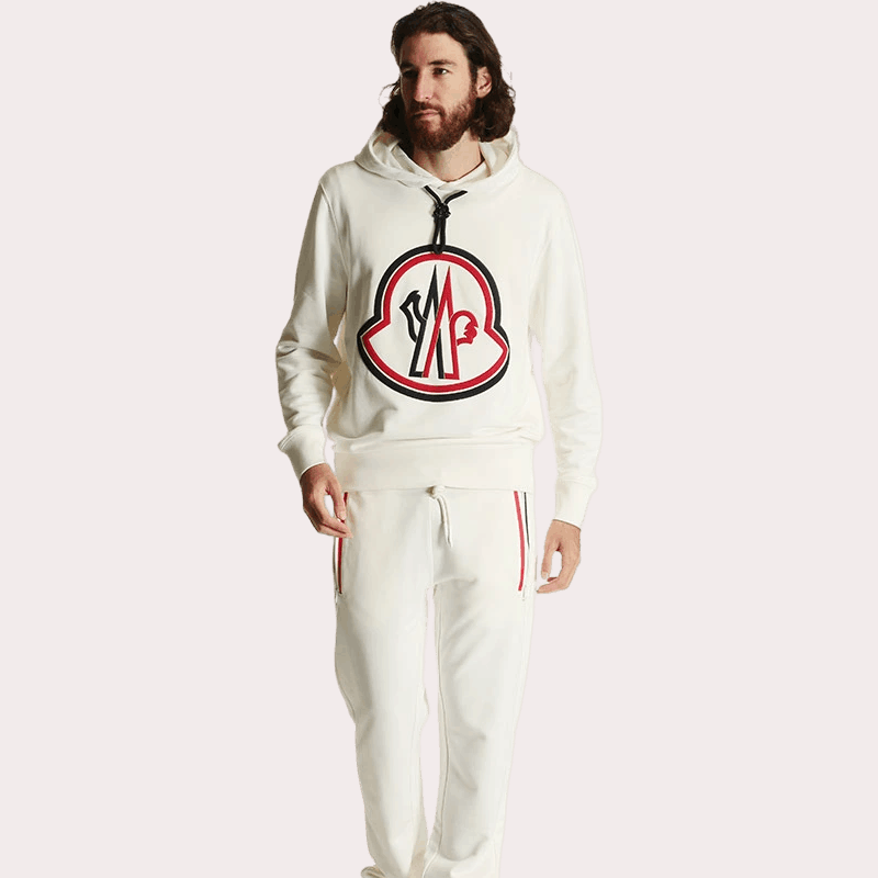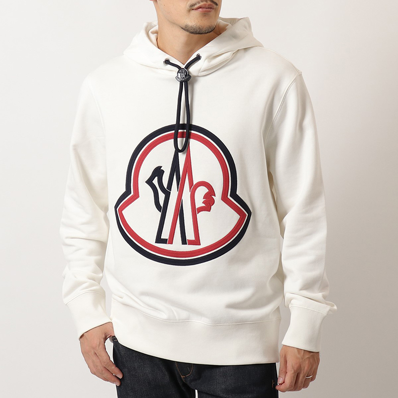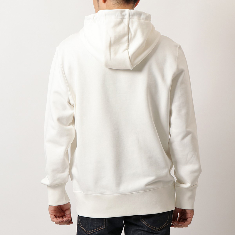 コットン100%の生地を使用した、肌触りの良いフード付きニット。フロントのビッグなロゴ刺繍が目を惹きます。カジュアルシーンをお洒落にコーディネートしてくれる一枚です。